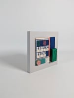 Mounted on grey painted pine wood, this beautiful composition features a vintage games card with hand stitched weaving alongside wooden games pieces and a vintage paper collage.