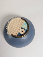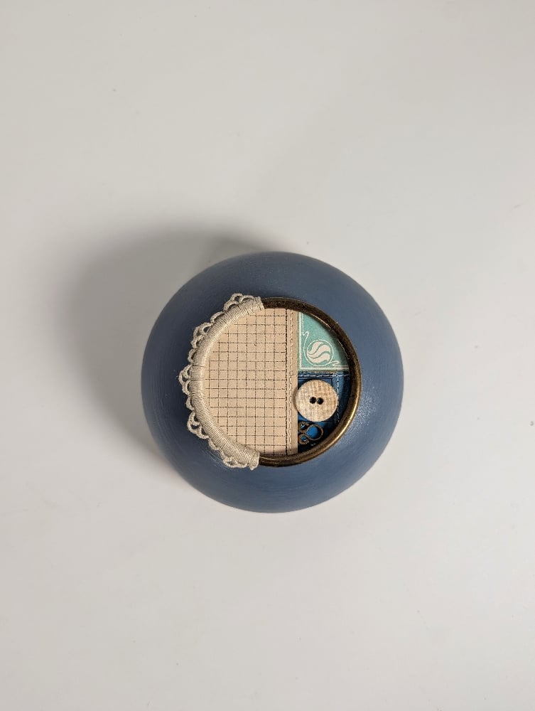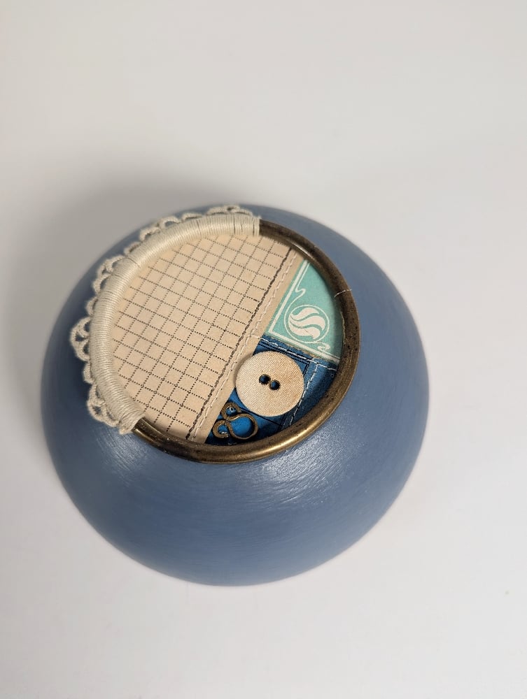 A charming blue and brass artwork, featuring a vintage brass ring adorned with hand stitch needle lace, paired with a paper collage and mounted on a vintage wooden receptacle (Because who needs boring frames anyway?!)