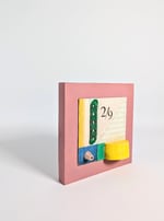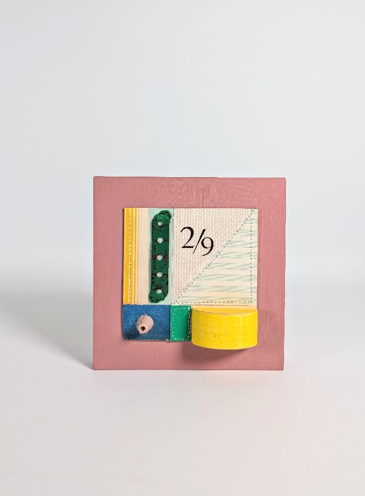 Mounted on dusky pink painted pine wood, this beautiful composition features a vintage mecano piece with intricate hand stitched needlelace alongside wooden and plastic games pieces and a vintage paper collage.